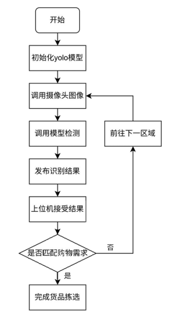 该子程序基于YOLOv3目标检测算法实现货品识别与拣选功能。程序启动 后,首先初始化摄像头设备并加载预训练的YOLOv3模型(通过ROS的 darknet_ros 框架),实时捕获货架图像并进行多目标检测。识别结果(包括物品 类别、位置及置信度)通过ROS话题(如/darknet_ros/detections)发送至上位机。 上位机将检测到的物品与预设购物清单进行比对,若匹配成功则结束流程;若未 匹配则控制机器人移动至下一货架区域重新扫描,直至完成所有目标检索。系统 通过动态阈值过滤低置信度检测结果,确保识别准确性,同时支持多任务循环处 理,适应复杂购物场景需求。 货品拣选子程序设计流程图如图所示: