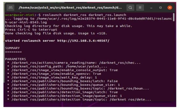 实时图像识别测试前首先需要将摄像头采集的信号画面显示到显示 屏上,通过显示屏就可以直观的看到摄像头识别的情况。通过在终端输入 以下指令实现实时检测。 roslaunch darknet_ros darknet_ros.launch 开启后: