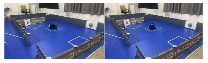 麦克朗姆轮自转测试与实现: 机器人需要完成自转过程,通过ROS直接控制底盘可以完成此项功能调试过程中,按照代码逻辑需要12秒即可完成360度的旋转过程,但是由 于地面摩擦和电池电量等现实问题,无法满足要求,所以实际测试将自转运行时间改为13秒,效果良好。
