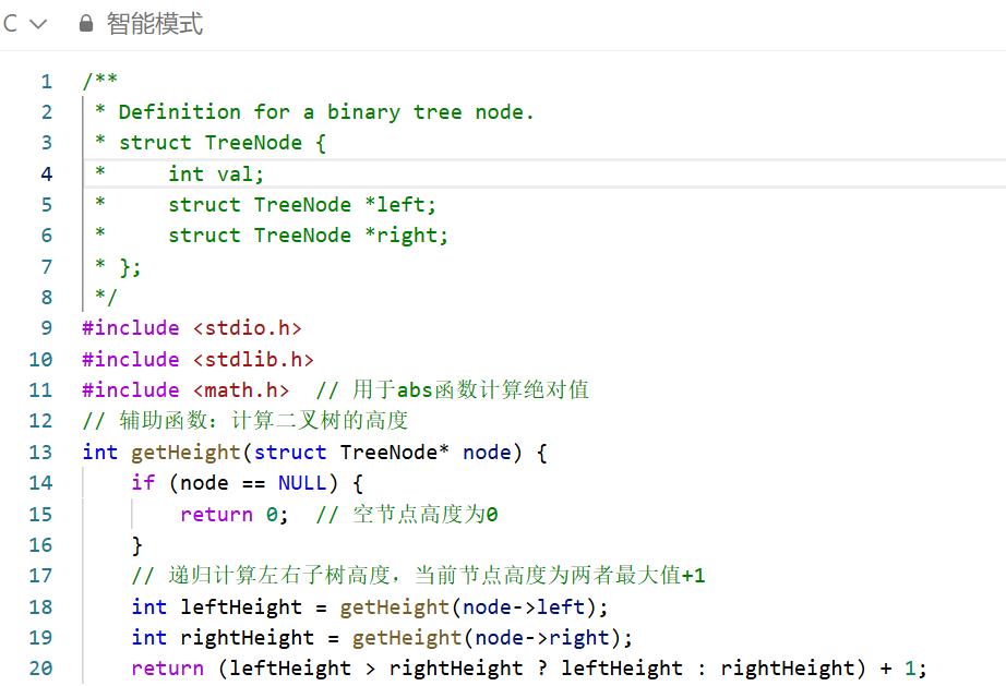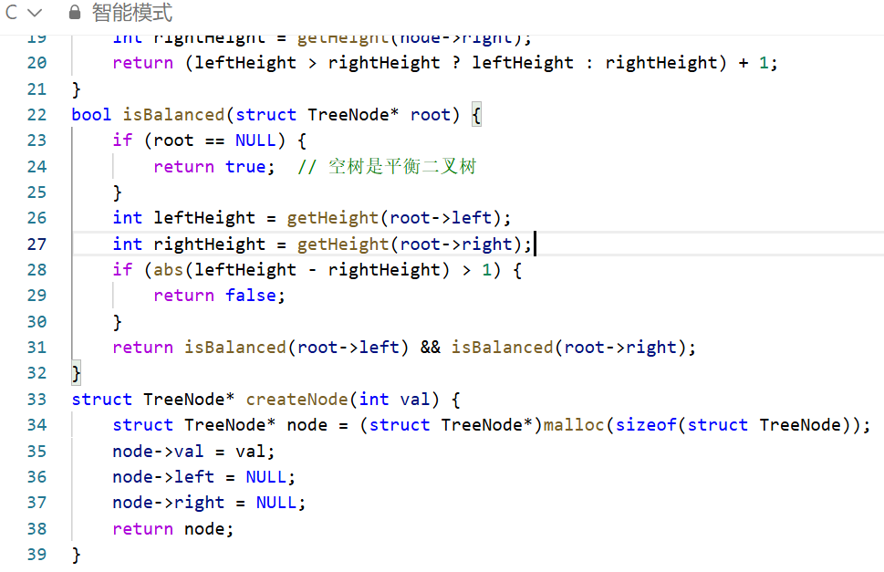 递归逻辑:利用二叉树的递归结构,将 “判断整棵树是否平衡” 拆解为 “判断根节点是否平衡”+“判断左子树是否平衡”+“判断右子树是否平衡”,逐层深入直到叶子节点。