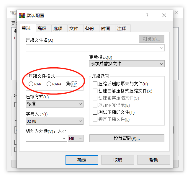 3、点击【压缩】选项后,弹出【默认配置】对话框,在【压缩文件格式】下方选择目标格式(即 ZIP),如果需要对转换后的ZIP文件进行加密,可以点击右侧【设置密码】进行设置。