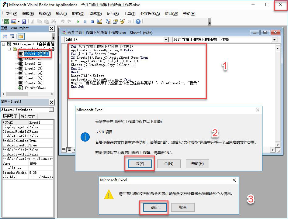 步骤二:编辑VBA代码。左键单击【工程资源管理器】中的【Sheet1 (总表)】后,在右侧代码窗口中键入以下代码,也可以选择复制粘贴。代码输入完成后,同时按下键盘上的【Ctrl + S】键保存代码,先左键单击【Microsoft Excel】对话框中的【是(Y)】按钮,再左键单击【Microsoft Excel】对话框中的【确定】按钮,最后关闭【Visual Basic编辑器】即可完成代码编辑。