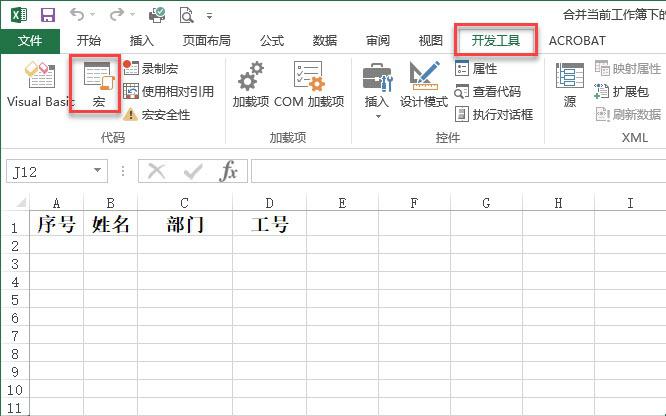 Sub 合并当前工作簿下的所有工作表()Application.ScreenUpdating = FalseFor j = 1 To Sheets.CountIf Sheets(j).Name <> ActiveSheet.Name ThenX = Range("A65536").End(xlUp).Row + 1Sheets(j).UsedRange.Copy Cells(X, 1)End IfNextRange("A1").SelectApplication.ScreenUpdating = TrueMsgBox "当前工作簿下的全部工作表已经合并完毕!", vbInformation, "提示"End Sub步骤三:Microsoft Excel快速合并当前工作簿下的所有工作表使用流程。执行VBA代码,首先需要在菜单栏中显示【开发工具】。显示【开发工具】详细操作流程请参照:PPT小技巧:如何把视频嵌入到PPT演示文稿中合并成一个文件?PPT和Excel操作流程基本一致。左键单击菜单栏中的【开发工具】选项卡,左键单击【代码】功能区中的【宏】按钮。