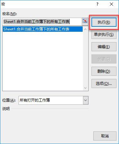 步骤四:左键单击选中【宏】对话框中的【Sheet1.合并当前工作簿下的所有工作表】后,左键单击【执行(R)】按钮。