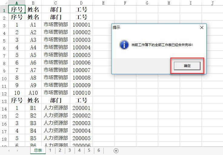 步骤五:左键单击【提示】对话框中的【确定】按钮即可完成合并当前工作簿下的所有工作表。