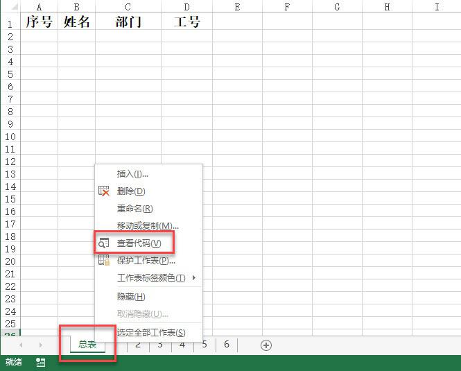 步骤一:左键双击打开素材文件【合并当前工作簿下的所有工作表.xlsx】Microsoft Excel工作表。如需编辑VBA代码,首先需要打开【Visual Basic编辑器】。右键单击【总表】工作表,左键单击右键菜单中的【查看代码(V)】即可打开【Visual Basic编辑器】。