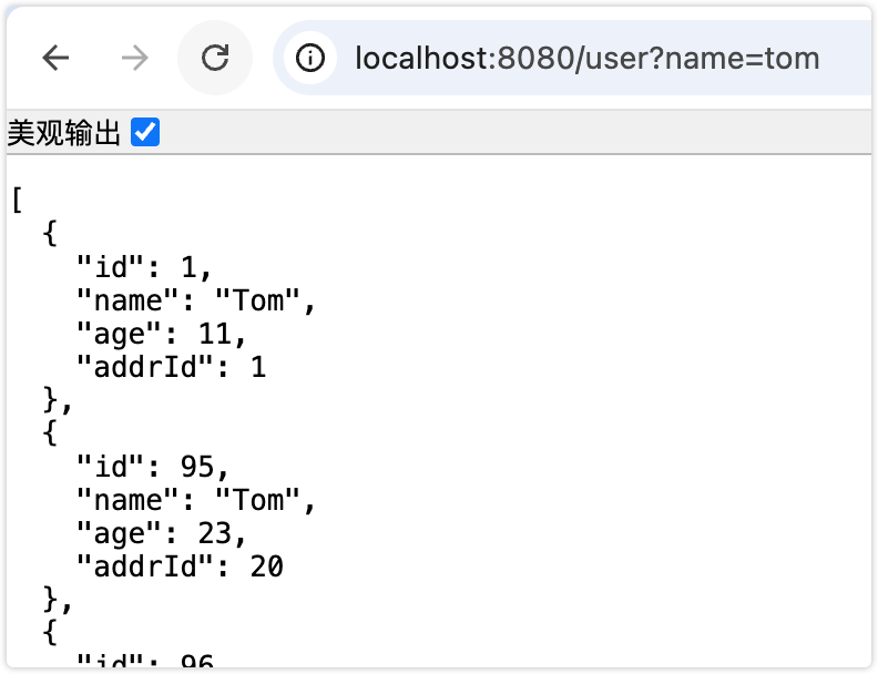 public class DemoController {@Autowiredprivate DemoDao demoDao;@RequestMapping("/user")public List<User> listUser(String name){return demoDao.selectUser(name);}