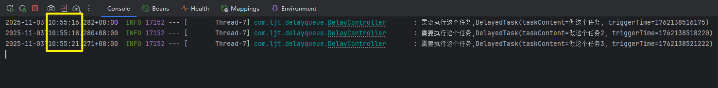 public class DelayController {private final RedissonClient redissonClient;private volatile boolean QUEUE_RUNNING = true;@GetMapping("/test")public void test() throws InterruptedException {RBlockingDeque<DelayedTask> blockingDeque = redissonClient.getBlockingDeque("my-delay-queue");RDelayedQueue<DelayedTask> delayedQueue = redissonClient.getDelayedQueue(blockingDeque);new Thread(()->{while (QUEUE_RUNNING){try {var delayedTask = blockingDeque.take();log.info("需要执行这个任务,{}", delayedTask);} catch (Exception e) {log.error("延时任务出错:{}", e);}}}).start();Thread.sleep(15000L);QUEUE_RUNNING = false;}@PostMapping("/add")public void add() {RBlockingDeque<DelayedTask> blockingDeque = redissonClient.getBlockingDeque("my-delay-queue");final RDelayedQueue<DelayedTask> delayedQueue = redissonClient.getDelayedQueue(blockingDeque);delayedQueue.offer(new DelayedTask("做这个任务", 3L),3L, TimeUnit.SECONDS);delayedQueue.offer(new DelayedTask("做这个任务2",5L),5L, TimeUnit.SECONDS);delayedQueue.offer(new DelayedTask("做这个任务3",8L),8L, TimeUnit.SECONDS);}