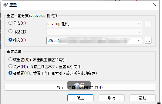 2.选择需要回退的版本,右键选择重置 "***(你自己的当前分支名)"到此版本,选择你需要的重置类型,我需要的是丢掉变更所以是硬重置