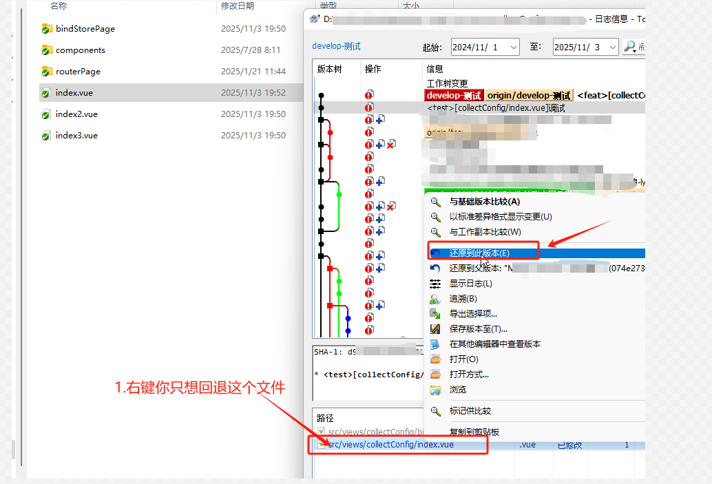 2.选择要回退到的版本,然后点击此版本提交的文件,右键你想还原的A文件(因为你一个版本里边有好多文件,如果你只想回退此版本的一个文件,而不是整个项目到这个版本,需要右键单独文件),然后点击还原到此版本,