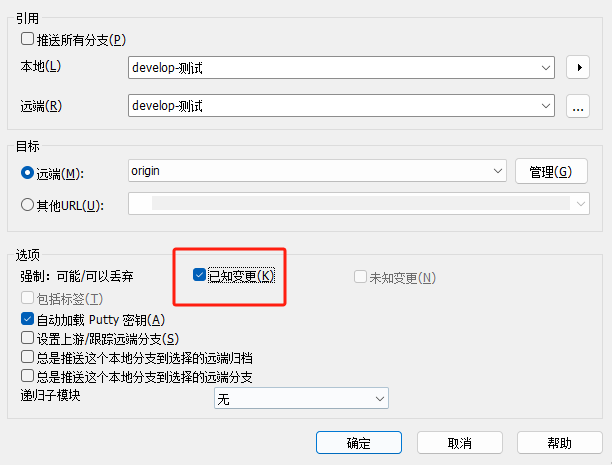 3.回退后推送分支到远端,需要选择已知变更(类似于强制推送)