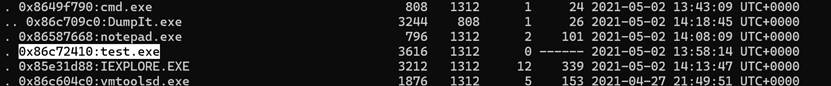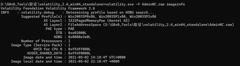 D:\G0x0_Tools\取证\volatility_2.6_win64_standalone>volatility.exe -f AdminNC.raw --profile=Win2003SP1x86 pstreeVolatility Foundation Volatility Framework 2.6Name                                                  Pid   PPid   Thds   Hnds Time-------------------------------------------------- ------ ------ ------ ------ ----0x86f01648:System                                      4      0     61    324 1970-01-01 00:00:00 UTC+0000. 0x86998ce0:smss.exe                                 484      4      3     18 2021-04-27 21:51:25 UTC+0000.. 0x866589e0:csrss.exe                               532    484     11    449 2021-04-27 21:51:25 UTC+0000.. 0x86d35430:winlogon.exe                            572    484     17    470 2021-04-27 21:51:26 UTC+0000... 0x8665e998:taskmgr.exe                           2228    572      3     81 2021-05-02 14:00:06 UTC+0000... 0x8670b6d8:lsass.exe                              636    572     30    427 2021-04-27 21:51:26 UTC+0000... 0x86498a48:services.exe                           624    572     16    290 2021-04-27 21:51:26 UTC+0000.... 0x865de118:msdtc.exe                            1344    624     13    146 2021-04-27 21:51:33 UTC+0000.... 0x865e56c8:svchost.exe                           908    624     10    231 2021-04-27 21:51:26 UTC+0000.... 0x8671dd88:svchost.exe                          1552    624      2     37 2021-04-27 21:51:33 UTC+0000.... 0x86a72d88:svchost.exe                          1924    624     18    141 2021-04-27 21:51:37 UTC+0000.... 0x86b523a8:svchost.exe                          1056    624     40   1059 2021-04-27 21:51:27 UTC+0000..... 0x85e3ad88:wuauclt.exe                         2676   1056      3    111 2021-04-27 21:52:36 UTC+0000.... 0x86706bf8:spoolsv.exe                          1316    624     12    129 2021-04-27 21:51:33 UTC+0000.... 0x86d36430:vmtoolsd.exe                         1712    624      6    257 2021-04-27 21:51:36 UTC+0000.... 0x866a9b70:vmacthlp.exe                          820    624      1     26 2021-04-27 21:51:26 UTC+0000.... 0x86951d88:svchost.exe                           832    624      5     91 2021-04-27 21:51:26 UTC+0000..... 0x868751f0:wmiprvse.exe                        2924    832      4    147 2021-04-27 21:50:46 UTC+0000.... 0x8688dc58:svchost.exe                           964    624      9    138 2021-04-27 21:51:27 UTC+0000.... 0x86c79430:svchost.exe                          1480    624      2     56 2021-04-27 21:51:33 UTC+0000.... 0x85e2fd88:TPAutoConnSvc.e                      2016    624      6     93 2021-04-27 21:51:37 UTC+0000..... 0x86888540:TPAutoConnect.e                     1408   2016      1     67 2021-04-27 21:49:51 UTC+0000.... 0x86953d88:svchost.exe                          1044    624     13    164 2021-04-27 21:51:27 UTC+0000.... 0x86c15758:dllhost.exe                           252    624     15    195 2021-04-27 21:51:37 UTC+00000x86c247d8:rundll32.exe                             1172    812      0 ------ 2021-05-02 14:05:56 UTC+00000x86d85858:explorer.exe                             1312   1880     11    372 2021-04-27 21:49:50 UTC+0000. 0x868edd88:IEXPLORE.EXE                            2844   1312      5    310 2021-05-02 13:41:50 UTC+0000.. 0x867e87f8:wscript.exe                            3384   2844      3    140 2021-05-02 13:49:38 UTC+0000... 0x869e8bf8:nVQNaizXBUqv.ex                       3568   3384      2    108 2021-05-02 13:49:39 UTC+0000.... 0x865eeb80:cmd.exe                              1676   3568      1     27 2021-05-02 13:52:55 UTC+0000. 0x8649f790:cmd.exe                                  808   1312      1     24 2021-05-02 13:43:09 UTC+0000.. 0x86c709c0:DumpIt.exe                             3244    808      1     26 2021-05-02 14:18:45 UTC+0000. 0x86587668:notepad.exe                              796   1312      2    101 2021-05-02 14:08:09 UTC+0000. 0x86c72410:test.exe                                3616   1312      0 ------ 2021-05-02 13:58:14 UTC+0000. 0x85e31d88:IEXPLORE.EXE                            3212   1312     12    339 2021-05-02 14:13:47 UTC+0000. 0x86c604c0:vmtoolsd.exe                            1876   1312      5    153 2021-04-27 21:49:51 UTC+0000. 0x86d502d8:ctfmon.exe                              1700   1312      1    140 2021-04-27 21:49:51 UTC+0000. 0x86c6e6f0:calc.exe                                3304   1312      2     97 2021-05-02 14:14:45 UTC+00000x86b957c8:conime.exe                               2820   2744      1     32 2021-04-27 22:20:3