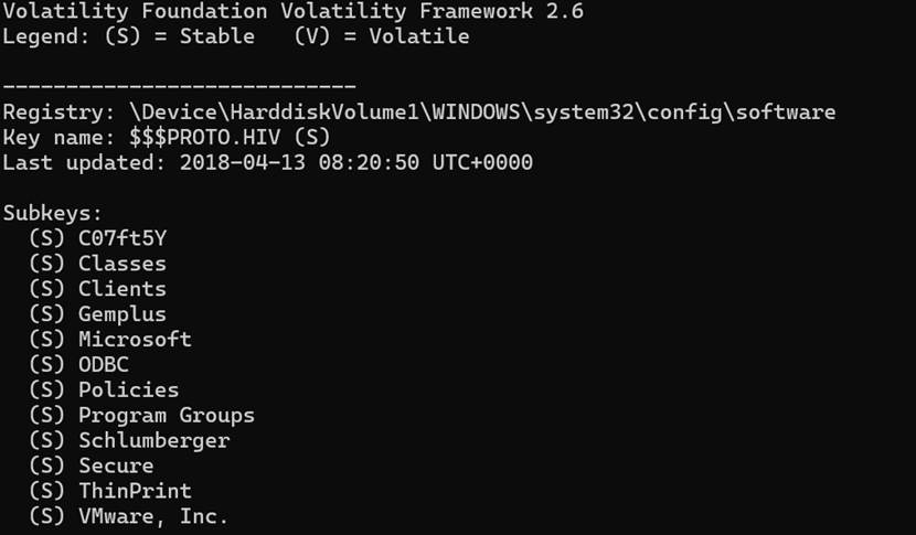 volatility.exe -f AdminNC.raw --profile=Win2003SP1x86 -o 0xe171b008 printkey