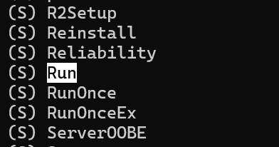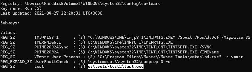 volatility.exe -f AdminNC.raw --profile=Win2003SP1x86 -o 0xe171b008 -K "Microsoft\Windows\CurrentVersion\Run" printkey