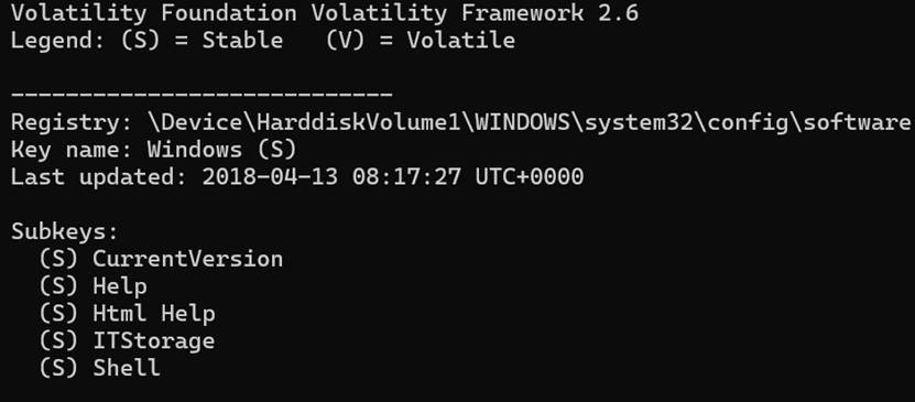 volatility.exe -f AdminNC.raw --profile=Win2003SP1x86 -o 0xe171b008 -K "Microsoft\Windows" printkey