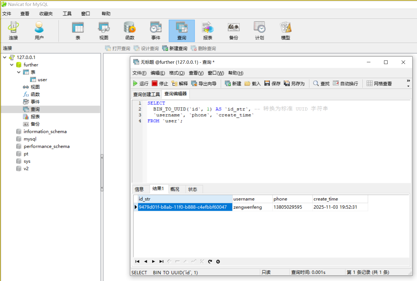 -- 查询:用 BIN_TO_UUID() 转为字符串可读