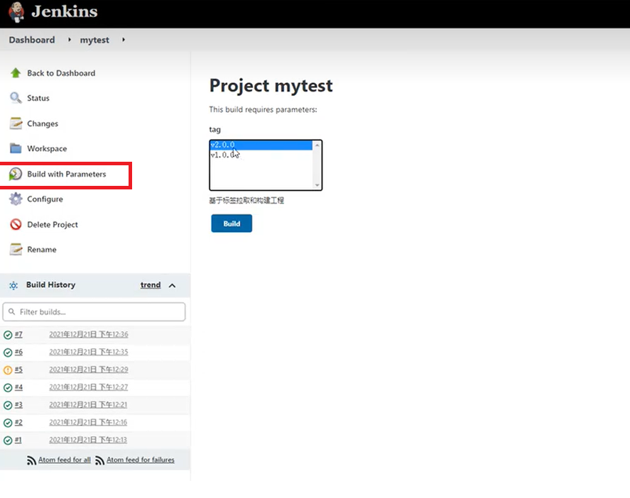 打开 Jenkins中的 Build with Parameters页面,点击【Build】按钮,就可以对不同的标签进行构建了