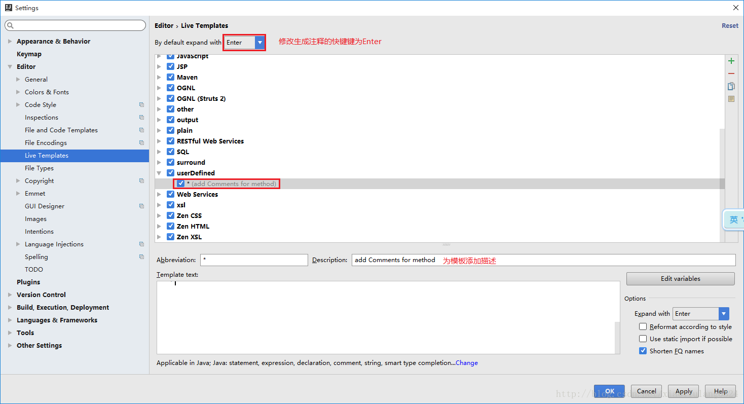 /**+Enter,这里我们也按照这种习惯来设置IDEA的方法注释