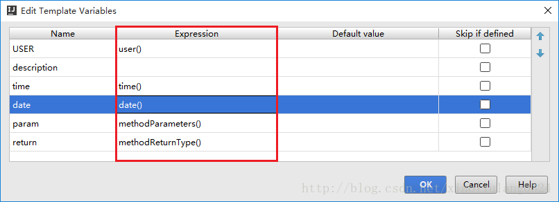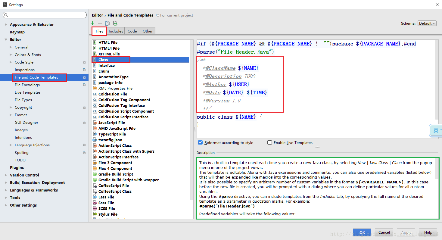(3)${USER}、${DATE}、${TIME}:设置创建类的用户、创建的日期和时间,这些事IDEA内置的方法,还有一些其他的方法在绿色框标注的位置,比如你想添加项目名则可以使用${PROJECT_NAME}