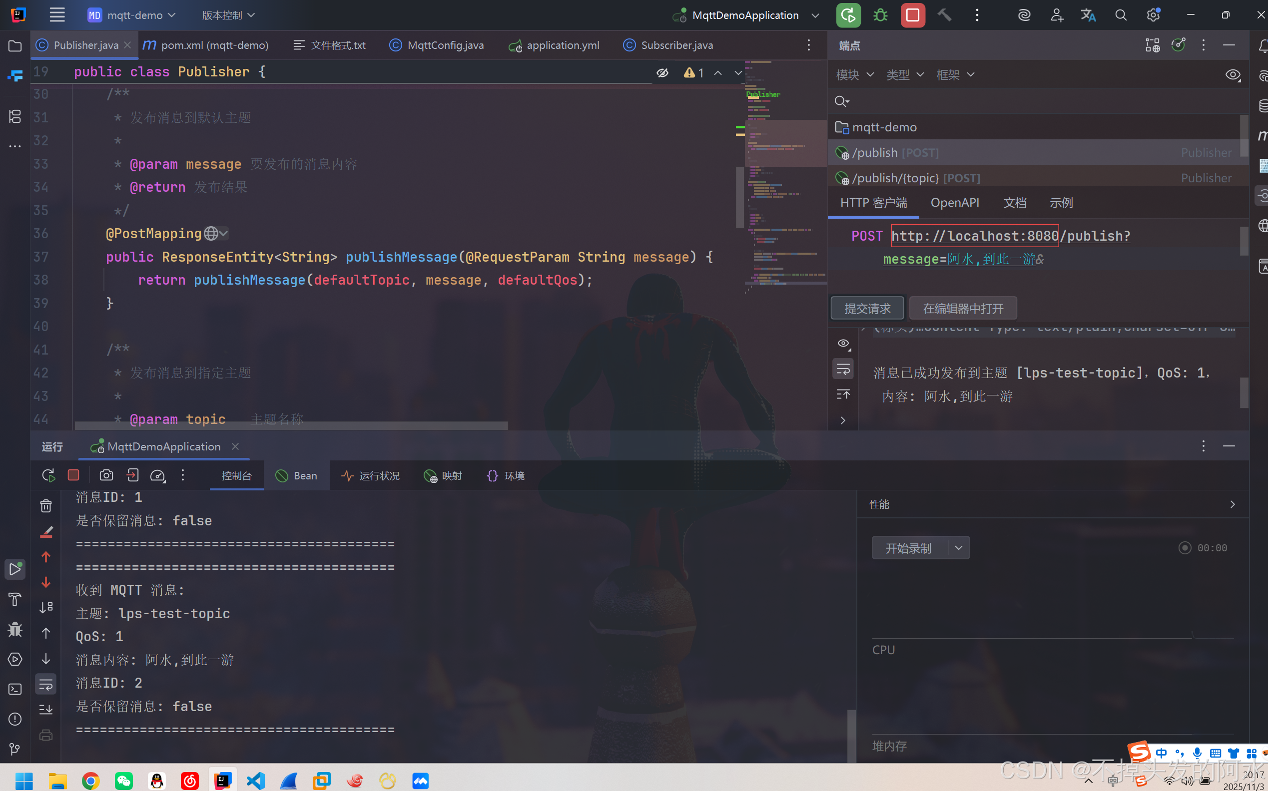 public class Publisher {@Autowiredprivate MqttClient mqttClient;@Value("${mqtt.topic}")private String defaultTopic;@Value("${mqtt.default-qos}")private int defaultQos;/*** 发布消息到默认主题** @param message 要发布的消息内容* @return 发布结果*/@PostMappingpublic ResponseEntity<String> publishMessage(@RequestParam String message) {return publishMessage(defaultTopic, message, defaultQos);}/*** 发布消息到指定主题** @param topic   主题名称* @param message 消息内容* @param qos     QoS 等级(0, 1, 2)* @return 发布结果*/@PostMapping("/{topic}")public ResponseEntity<String> publishToTopic(@PathVariable String topic,@RequestParam String message,@RequestParam(required = false, defaultValue = "1") int qos) {return publishMessage(topic, message, qos);}/*** 发布消息的核心方法** @param topic   主题* @param message 消息内容* @param qos     QoS 等级* @return 发布结果*/private ResponseEntity<String> publishMessage(String topic, String message, int qos) {try {// 确保客户端已连接if (!mqttClient.isConnected()) {mqttClient.reconnect();}// 创建 MQTT 消息MqttMessage mqttMessage = new MqttMessage(message.getBytes(StandardCharsets.UTF_8));mqttMessage.setQos(qos);mqttMessage.setRetained(false);// 发布消息mqttClient.publish(topic, mqttMessage);return ResponseEntity.ok(String.format("消息已成功发布到主题 [%s],QoS: %d,内容: %s", topic, qos, message));} catch (MqttException e) {return ResponseEntity.status(500).body("发布消息失败: " + e.getMessage());}}