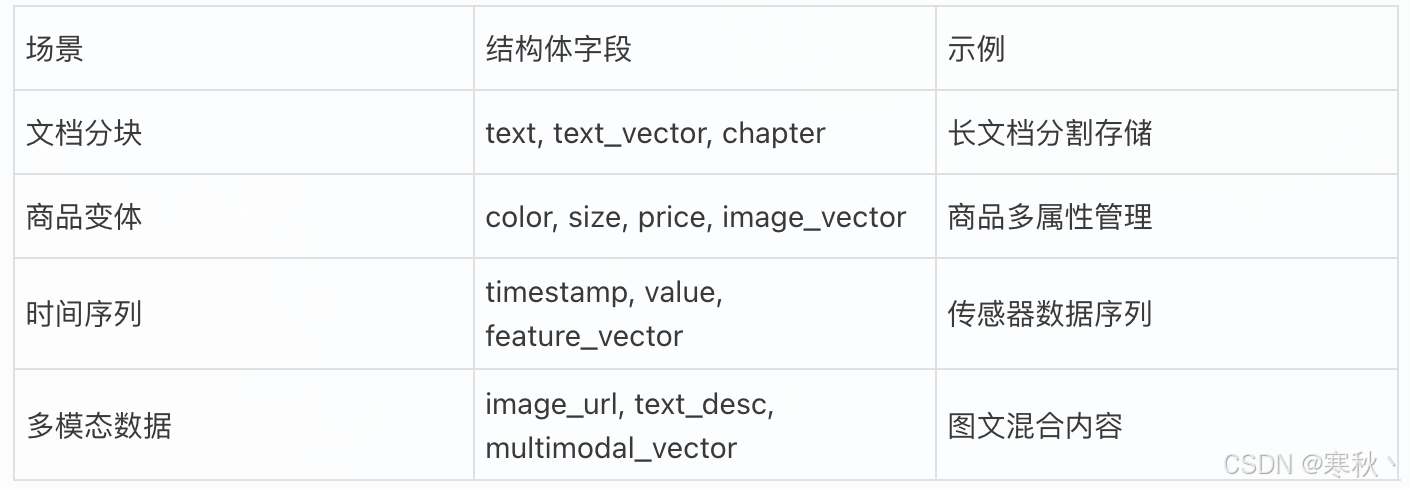 def create_struct_array_collection():"""创建包含结构体数组的Collection"""client = MilvusClient(uri="http://localhost:19530")if client.has_collection("struct_array_demo"):client.drop_collection("struct_array_demo")# 创建主Schemaschema = client.create_schema()# 添加主键字段schema.add_field(field_name="doc_id", datatype=DataType.INT64, is_primary=True, auto_id=True)# 添加文档级字段schema.add_field(field_name="doc_title", datatype=DataType.VARCHAR, max_length=200)schema.add_field(field_name="doc_author", datatype=DataType.VARCHAR, max_length=100)schema.add_field(field_name="doc_vector", datatype=DataType.FLOAT_VECTOR, dim=128)# 创建结构体Schemastruct_schema = client.create_struct_field_schema()# 添加结构体字段struct_schema.add_field("chunk_text", DataType.VARCHAR, max_length=1000 # 文本块内容)struct_schema.add_field("chunk_vector", DataType.FLOAT_VECTOR, dim=128, # 文本块向量mmap_enabled=True # 启用内存映射优化)struct_schema.add_field("chunk_type", DataType.VARCHAR, max_length=50 # 块类型:标题、段落、列表等)struct_schema.add_field("word_count", DataType.INT32 # 字数统计)# 添加结构体数组字段schema.add_field(field_name="chunks",datatype=DataType.ARRAY,element_type=DataType.STRUCT,struct_schema=struct_schema,max_capacity=50 # 最多50个文本块)# 配置索引参数index_params = client.prepare_index_params()# 为文档级向量字段创建索引index_params.add_index(field_name="doc_vector",index_type="IVF_FLAT",metric_type="COSINE",params={"nlist": 256})# 为结构体数组中的向量字段创建索引index_params.add_index(field_name="chunks[chunk_vector]", # 注意语法:字段名[结构体字段名]index_type="HNSW", # 结构体数组向量必须使用HNSWmetric_type="MAX_SIM_COSINE", # 专用度量类型params={"M": 16, # HNSW参数"efConstruction": 200})# 创建Collectionclient.create_collection(collection_name="struct_array_demo",schema=schema,index_params=index_params)print("✅ 结构体数组Collection创建成功")return clientdef insert_struct_array_data(client):"""插入结构体数组数据示例"""data = [{"doc_title": "人工智能发展历程","doc_author": "科技作者A","doc_vector": [0.1] * 128,"chunks": [{"chunk_text": "人工智能的概念最早可以追溯到20世纪50年代","chunk_vector": [0.11] * 128,"chunk_type": "引言","word_count": 15},{"chunk_text": "图灵测试是衡量机器智能的重要标准","chunk_vector": [0.12] * 128, "chunk_type": "正文","word_count": 12},{"chunk_text": "深度学习的发展推动了人工智能的新浪潮","chunk_vector": [0.13] * 128,"chunk_type": "结论","word_count": 10}]},{"doc_title": "机器学习算法综述", "doc_author": "数据科学家B","doc_vector": [0.2] * 128,"chunks": [{"chunk_text": "监督学习需要标注数据进行训练","chunk_vector": [0.21] * 128,"chunk_type": "分类","word_count": 8},{"chunk_text": "无监督学习可以发现数据中的隐藏模式","chunk_vector": [0.22] * 128,"chunk_type": "聚类", "word_count": 9}]}]result = client.insert(collection_name="struct_array_demo",data=data)print(f"✅ 插入 {len(result['ids'])} 条结构体数组数据")print(f"生成的文档ID: {result['ids']}")return resultdef search_struct_array_examples(client):"""结构体数组搜索示例"""from pymilvus import EmbeddingListprint("\n🔍 结构体数组搜索示例:")# 1. 文档级向量搜索print("1. 文档级向量搜索")doc_results = client.search(collection_name="struct_array_demo",data=[[0.15] * 128], # 文档级查询向量anns_field="doc_vector",search_params={"params": {"nprobe": 10}},limit=2,output_fields=["doc_title", "doc_author"])for hits in doc_results:for hit in hits:print(f" 文档标题: {hit['entity']['doc_title']}, 作者: {hit['entity']['doc_author']}")# 2. 结构体数组向量搜索 - 单个EmbeddingListprint("\n2. 结构体数组向量搜索 - 单个查询")embedding_list1 = EmbeddingList()embedding_list1.add([0.115] * 128) # 添加一个查询向量chunk_results1 = client.search(collection_name="struct_array_demo",data=[embedding_list1], # 使用EmbeddingList包装anns_field="chunks[chunk_vector]", # 指定结构体数组中的向量字段search_params={"metric_type": "MAX_SIM_COSINE"},limit=3,output_fields=["doc_title", "chunks[chunk_text]", "chunks[chunk_type]"])print(" 单个查询结果:")for hits in chunk_results1:for hit in hits:print(f" 文档: {hit['entity']['doc_title']}")if 'chunks' in hit['entity']:for chunk in hit['entity']['chunks']:print(f" 文本块: {chunk['chunk_text'][:30]}...")# 3. 结构体数组向量搜索 - 多个EmbeddingListprint("\n3. 结构体数组向量搜索 - 多个查询")embedding_list2 = EmbeddingList()embedding_list2.add([0.125] * 128) # 第一个查询向量embedding_list2.add([0.135] * 128) # 第二个查询向量embedding_list3 = EmbeddingList() embedding_list3.add([0.145] * 128) # 第三个查询向量chunk_results2 = client.search(collection_name="struct_array_demo",data=[embedding_list2, embedding_list3], # 多个EmbeddingListanns_field="chunks[chunk_vector]",search_params={"metric_type": "MAX_SIM_COSINE"},limit=2,output_fields=["doc_title", "chunks[chunk_text]"])print(" 多个查询结果:")for i, hits in enumerate(chunk_results2):print(f" 查询{i+1}结果:")for hit in hits:print(f" 文档: {hit['entity']['doc_title']}, 距离: {hit['distance']:.4f}")# 执行示例