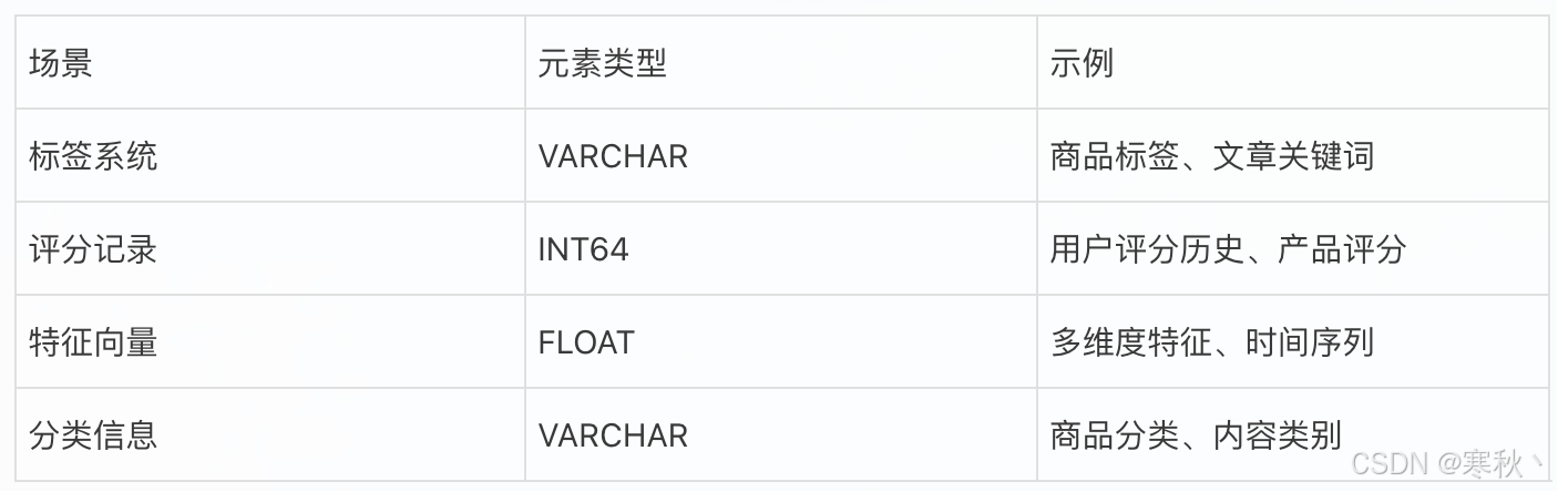 def create_array_collection():"""创建包含ARRAY字段的Collection"""client = MilvusClient(uri="http://localhost:19530")if client.has_collection("array_demo"):client.drop_collection("array_demo")schema = client.create_schema(auto_id=False,enable_dynamic_fields=True,)# 添加ARRAY字段 - 字符串数组schema.add_field(field_name="tags", datatype=DataType.ARRAY, element_type=DataType.VARCHAR,max_capacity=10, # 最大10个标签max_length=50, # 每个标签最大50字符nullable=True)# 添加ARRAY字段 - 整数数组schema.add_field(field_name="ratings",datatype=DataType.ARRAY,element_type=DataType.INT64, max_capacity=5, # 最大5个评分nullable=True)# 添加ARRAY字段 - 浮点数数组schema.add_field(field_name="features",datatype=DataType.ARRAY,element_type=DataType.FLOAT,max_capacity=8, # 最大8个特征nullable=True)# 主键和向量字段schema.add_field(field_name="pk", datatype=DataType.INT64, is_primary=True)schema.add_field(field_name="embedding", datatype=DataType.FLOAT_VECTOR, dim=32)# 配置索引index_params = client.prepare_index_params()# 为ARRAY字段创建索引(可选)index_params.add_index(field_name="tags",index_type="AUTOINDEX", index_name="tags_idx")# 向量字段索引index_params.add_index(field_name="embedding",index_type="IVF_FLAT",metric_type="COSINE",params={"nlist": 128})client.create_collection(collection_name="array_demo",schema=schema,index_params=index_params)print("✅ ARRAY字段Collection创建成功")return clientdef insert_array_data(client):"""插入ARRAY字段数据示例"""data = [{"pk": 1,"tags": ["科技", "智能手机", "5G", "摄影"],"ratings": [5, 4, 5, 4],"features": [0.8, 0.6, 0.9, 0.7, 0.5],"embedding": [0.1] * 32},{"pk": 2, "tags": ["文学", "小说", "经典"],"ratings": [5, 5, 4, 3],"features": [0.3, 0.7, 0.2, 0.8, 0.4],"embedding": [0.2] * 32},{"pk": 3,"tags": None, # 整个tags数组为空"ratings": [4, 3],"features": [0.6, 0.4, 0.5, 0.3],"embedding": [0.3] * 32},{"pk": 4,"tags": ["美食", "烹饪", "食谱"],"ratings": None, # 整个ratings数组为空"features": [0.9, 0.8, 0.7],"embedding": [0.4] * 32},{"pk": 5,# tags字段完全缺失"ratings": [5, 5, 5, 4, 5],"features": [0.5, 0.6, 0.7, 0.8, 0.9, 1.0],"embedding": [0.5] * 32}]result = client.insert(collection_name="array_demo",data=data)print(f"✅ 插入 {len(result['ids'])} 条ARRAY字段数据")return resultdef query_array_examples(client):"""ARRAY字段查询示例"""print("\n🔍 ARRAY字段查询示例:")# 1. 空数组查询print("1. 空数组查询 - tags is not null")results = client.query(collection_name="array_demo",filter="tags is not null",output_fields=["pk", "tags"])for item in results:print(f" ID: {item['pk']}, 标签: {item['tags']}")# 2. 数组元素索引查询print("\n2. 数组元素索引查询 - ratings[0] > 4")results = client.query(collection_name="array_demo",filter="ratings[0] > 4", # 第一个评分大于4output_fields=["pk", "ratings"])for item in results:print(f" ID: {item['pk']}, 评分: {item['ratings']}")# 3. 数组包含查询print("\n3. 数组包含查询 - array_contains(tags, '科技')")results = client.query(collection_name="array_demo",filter="array_contains(tags, '科技')",output_fields=["pk", "tags"])for item in results:print(f" ID: {item['pk']}, 标签: {item['tags']}")# 4. 数组长度查询print("\n4. 数组长度查询 - array_length(ratings) >= 3")results = client.query(collection_name="array_demo",filter="array_length(ratings) >= 3",output_fields=["pk", "ratings", "array_length(ratings) as rating_count"])for item in results:print(f" ID: {item['pk']}, 评分: {item['ratings']}, 数量: {item['rating_count']}")# 5. 向量搜索 + 数组过滤print("\n5. 向量搜索 + 数组过滤")search_results = client.search(collection_name="array_demo",data=[[0.15] * 32],anns_field="embedding",search_params={"params": {"nprobe": 10}},limit=3,output_fields=["pk", "tags", "ratings"],filter="array_contains(tags, '科技') and array_length(ratings) > 2")for hits in search_results:for hit in hits:print(f" ID: {hit['entity']['pk']}, 标签: {hit['entity']['tags']}")# 执行示例