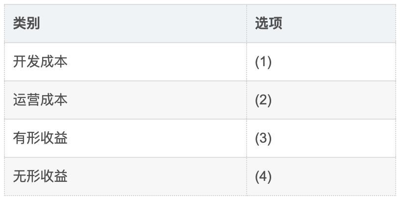 成本和收益是经济可行性评价的核心要素,成本一般分为开发成本和运营成本,收益包括有形收益和无形收益,请对照下列7项内容,将其序号分别填入成本和收益对应的类别。