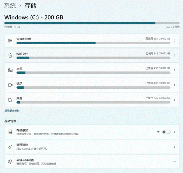 打开电脑的【设置-系统-存储】,点击【C盘】,点击【临时文件】勾选 “Windows 更新缓存”“临时文件”“回收站” 等选项,点击 “立即清理”, 通常可释放 2-10GB 空间。