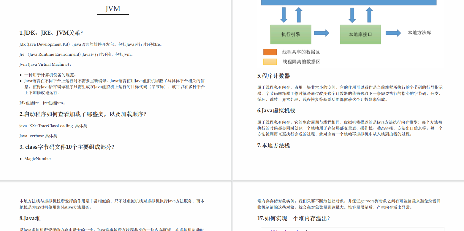 - 核心算法:可达性分析(GC Roots)、标记 - 清除(碎片多)、标记 - 复制(年轻代用)、标记 - 整理(老年代用)。