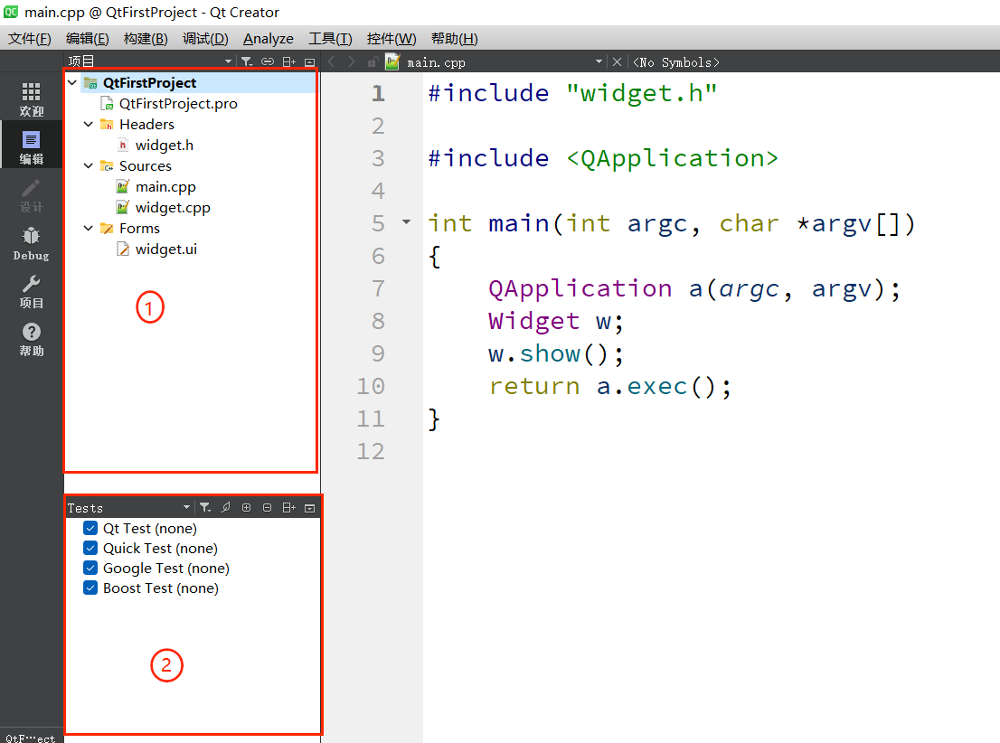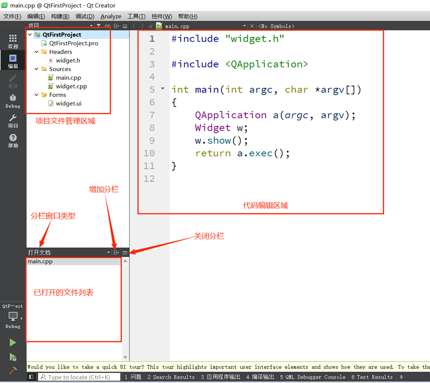 当打开或新建项目后,Qt Creator 会自动切换至编辑模式,此时界面主要由 “菜单栏”“模式选择栏”“边栏”“代码编辑区”“构建与运行控制区”“输出窗格” 六大模块组成,各模块分工明确,协同支撑整个开发流程。