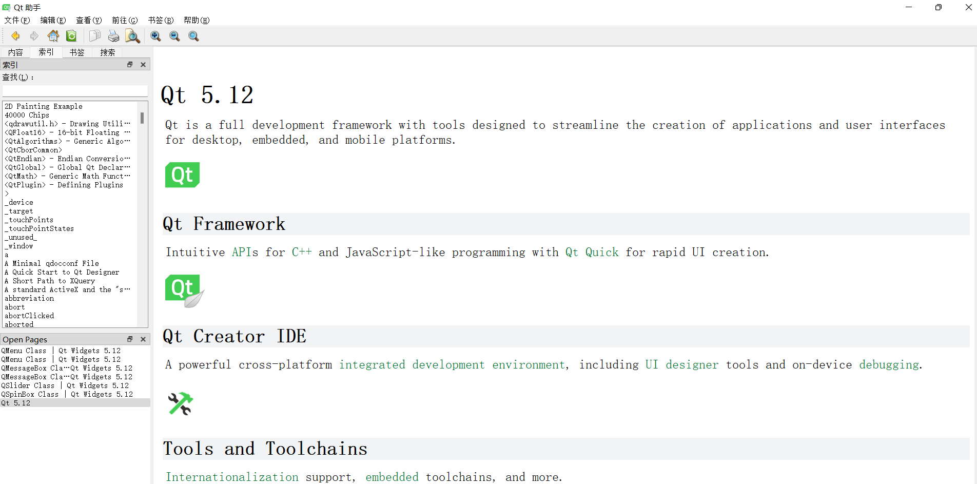- 目录:按模块分类展示 Qt 的所有帮助文档(如 Qt Core、Qt Widgets、Qt Network),适合系统性学习。