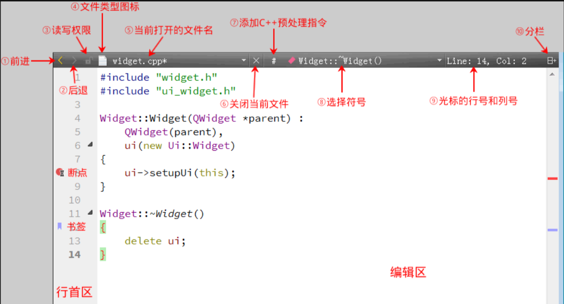 Widget类的构造函数、析构函数以及从父类QWidget继承的成员函数,方便快速定位类的定义与实现。- 书签视图(Bookmarks):展示代码中设置的书签,开发者可通过右键代码行号区域选择 “切换书签”(或快捷键 Ctrl+M)添加书签,后续通过书签视图快速跳转到目标代码行,适合在大型项目中标记关键代码位置。