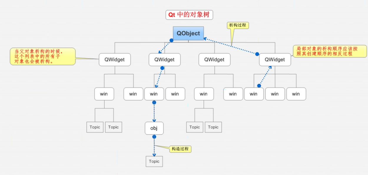 parent参数指定父对象。子对象会自动添加到父对象的children()列表中,形成树形结构(对象树)。 - 对象的析构顺序:当父对象被析构时,会自动遍历其