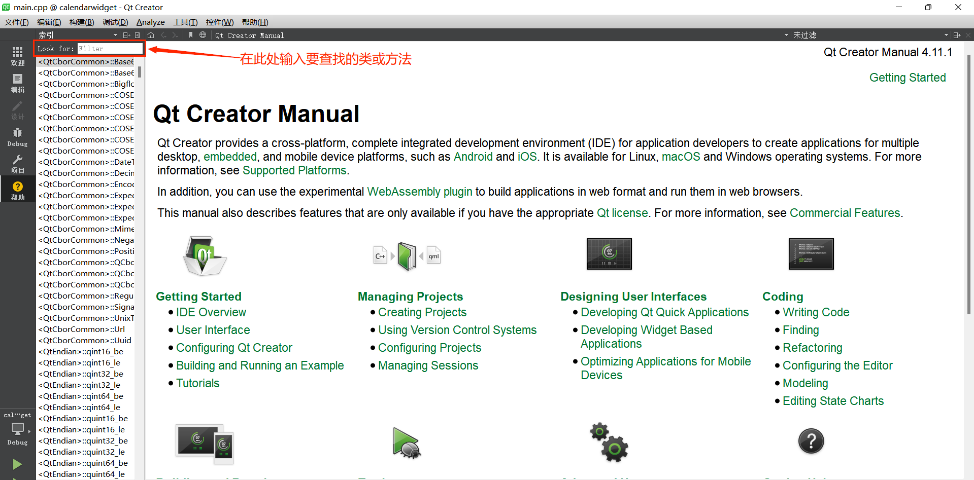 帮助模式:点击 Qt Creator 左侧模式选择栏中的 “帮助” 按钮,进入帮助模式。该模式包含以下核心功能: