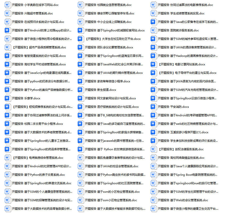 以上是某同学的毕业设计答辩的过程,如果你现在还没有参加答辩,还是开题阶段,已经选好了题目不知道怎么写开题报告,可以下面找找有没有自己符合自己题目的开题报告内容,列表中的开题报告都是往届真实的开题报告,可发送使用或参考。文末或底部来联xi可免费获取