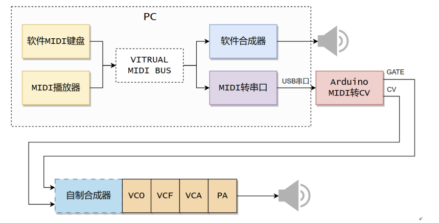 从这张图可以看出,Arduino的作用是将MIDI传输的数据转换成GATE信号和CV信号