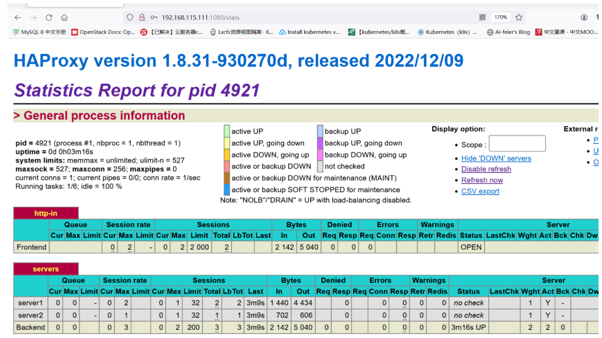 #   log 127.0.0.1   local1 noticelog /dev/log    local0 infolog /dev/log    local0 noticemaxconn 4096uid 99gid 99daemondefaultslog globalmode    httpoption  httplogretries 3maxconn 4096contimeout  5000clitimeout  50000srvtimeout  50000listen  webcluster 0.0.0.0:80option  httpchk GET /index.htmlbalance roundrobinserver  inst1 192.168.200.103:80 check inter 2000 fall 3server  inst1 192.168.200.104:80 check inter 2000 fall 3listen admin_statsbind 0.0.0.0:8000mode httpoption httplogmaxconn 100stats refresh 30sstats uri /statsstats realm Crushlinux\ Haproxystats auth  admin:adminstats hide-version
