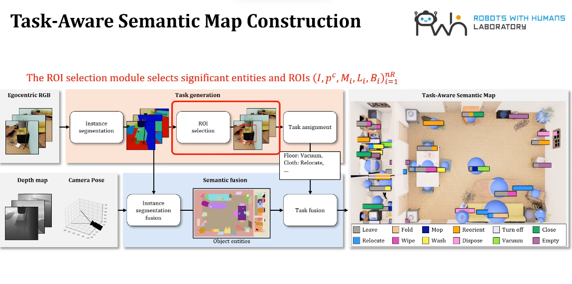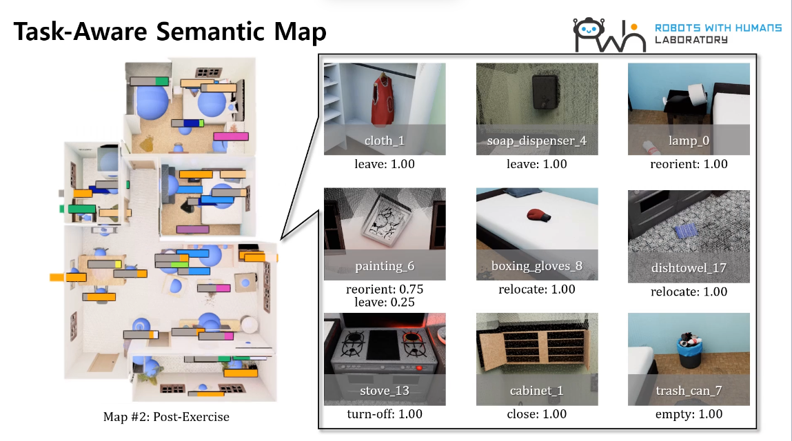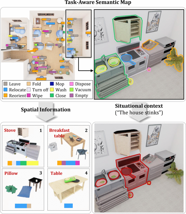 图1.TASMap会根据物体的状态分配相应的任务(上图)。左下方根据空间信息标出了机器人应优先关注的区域。右侧红色阴影部分代表与特定情境相关的物体。