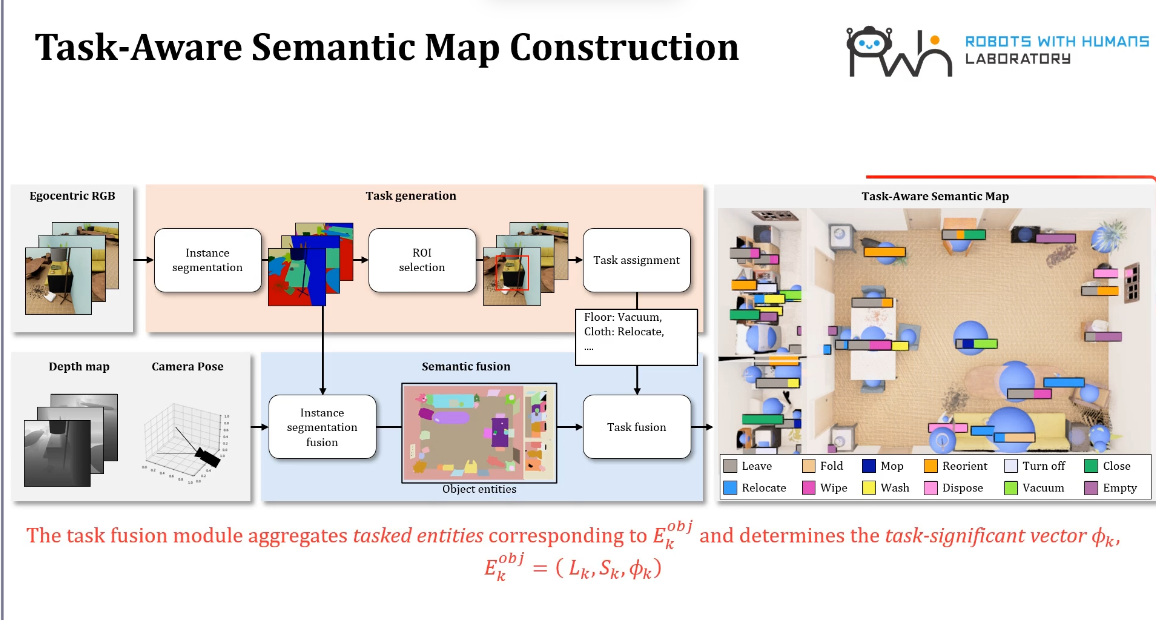 图2所提出的框架概述。在任务生成模块中,以自我为中心的RGB图像作为输入,将任务与图像中的每个对象关联起来。深度和相机姿态等输入用于语义融合模块,该模块将任务生成的结果与对象实体相结合,生成TASMap。右侧,对象实体以蓝色球体表示,条形图指示任务相关向量。