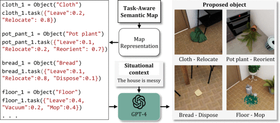图3.上下文任务建议过程。使用来自 TASMap 的 Python 地图表示(左图)和以自然语言提供的上下文“房子很乱”,在右侧提出相应的对象。