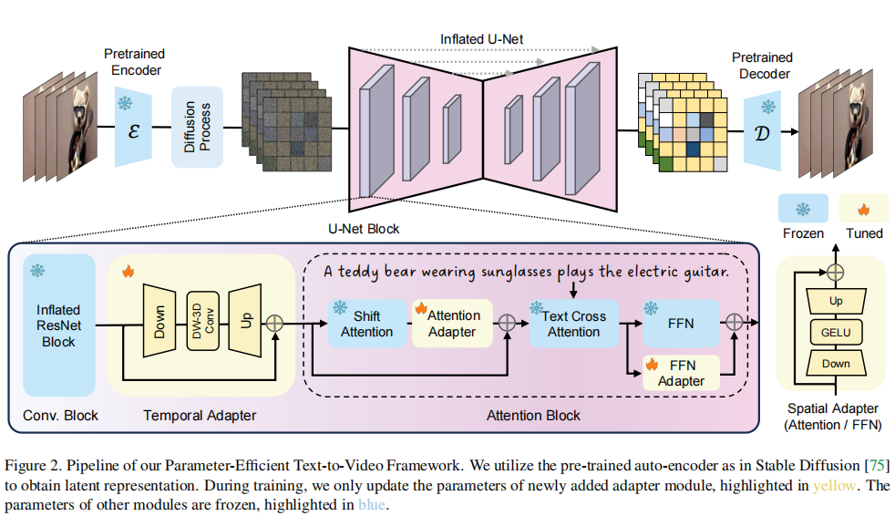 关键词:文本驱动视频生成、参数高效微调、潜在扩散模型、时空适配器、Latent-Shift Attention、视频超分辨率、文本引导视频编辑、轻量级模型架构、单样本视频编辑、高效推理