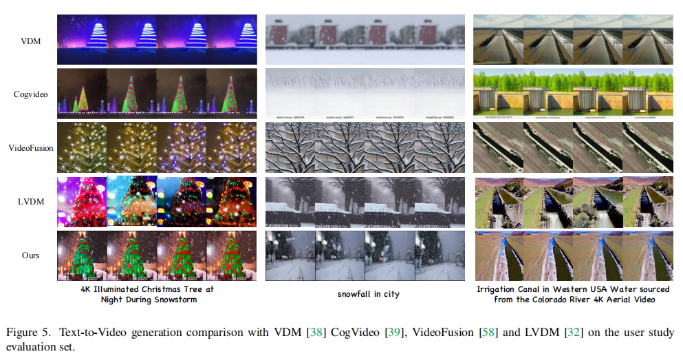 - 对比方法:CogVideo, Make-A-Video, Video LDM, Latent-Shift等。