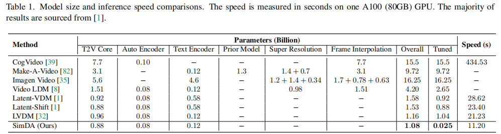 - 推理速度:SimDA仅需11.20秒,而CogVideo需434.53秒,快39倍。