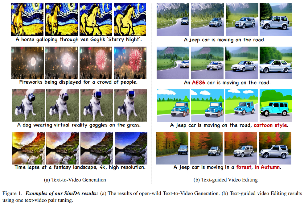 SimDA可轻松扩展至单样本视频编辑(One-shot Editing),灵感来自Tune-A-Video。