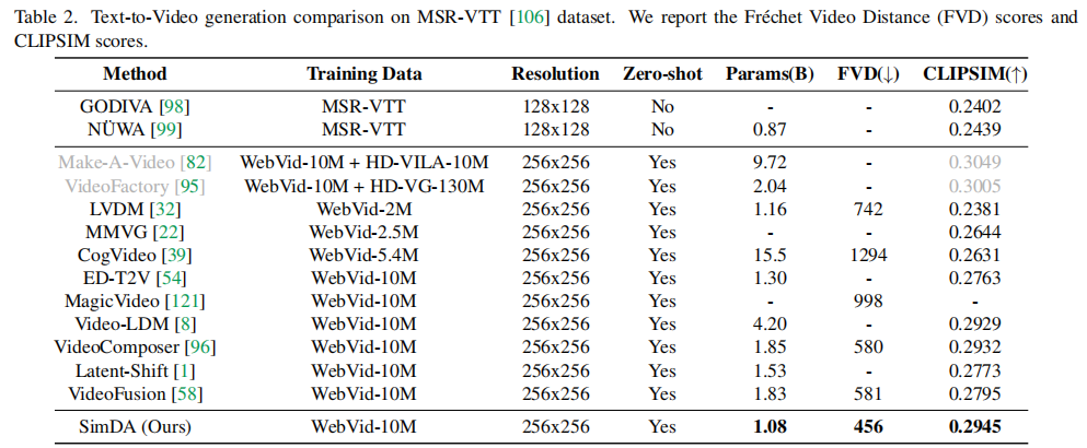 - SimDA (Ours) 在FVD(456)和CLIPSIM(0.2945)上均优于或媲美现有方法。