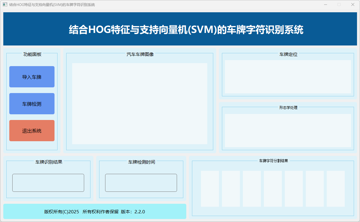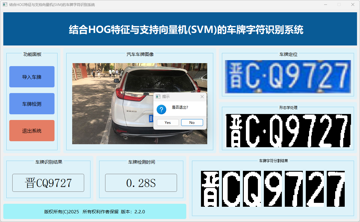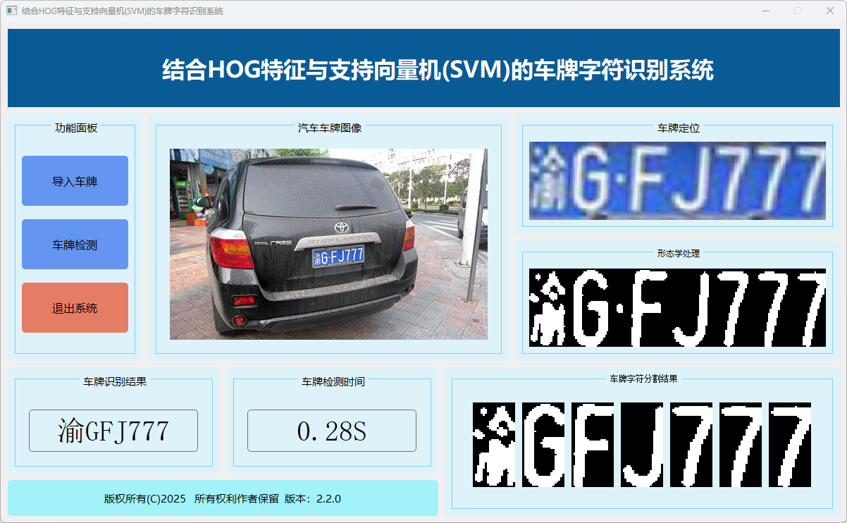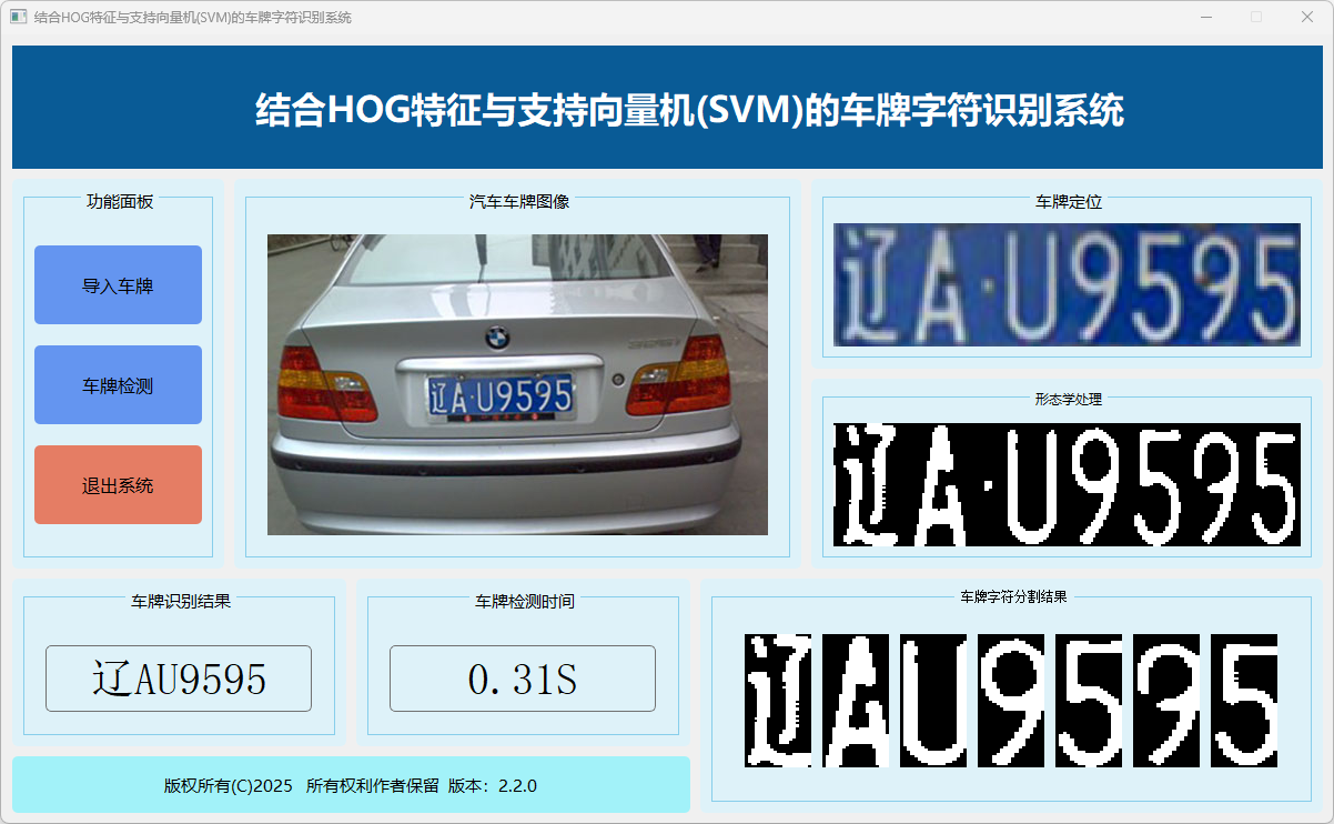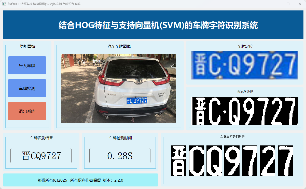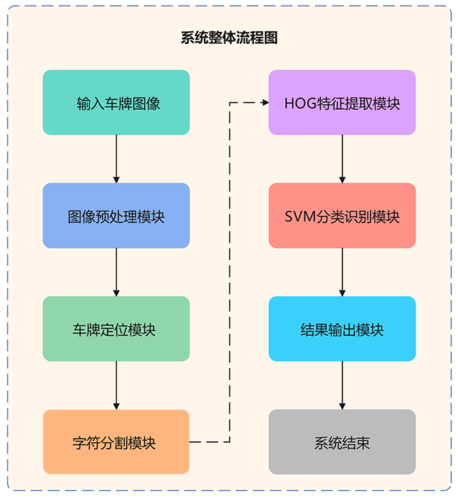本系统旨在通过结合HOG特征提取与支持向量机(SVM)分类器,实现对车牌图像中字符的高效识别。
